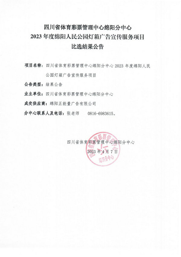 四川省體育彩票管理中心綿陽分中心2023年度綿陽人民公園燈箱廣告宣傳服務(wù)項目比選結(jié)果公告