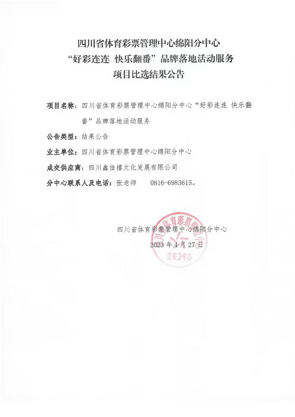 四川省體育彩票管理中心綿陽分中心“好彩連連 快樂翻番”品牌落地活動服務項目比選結果公告