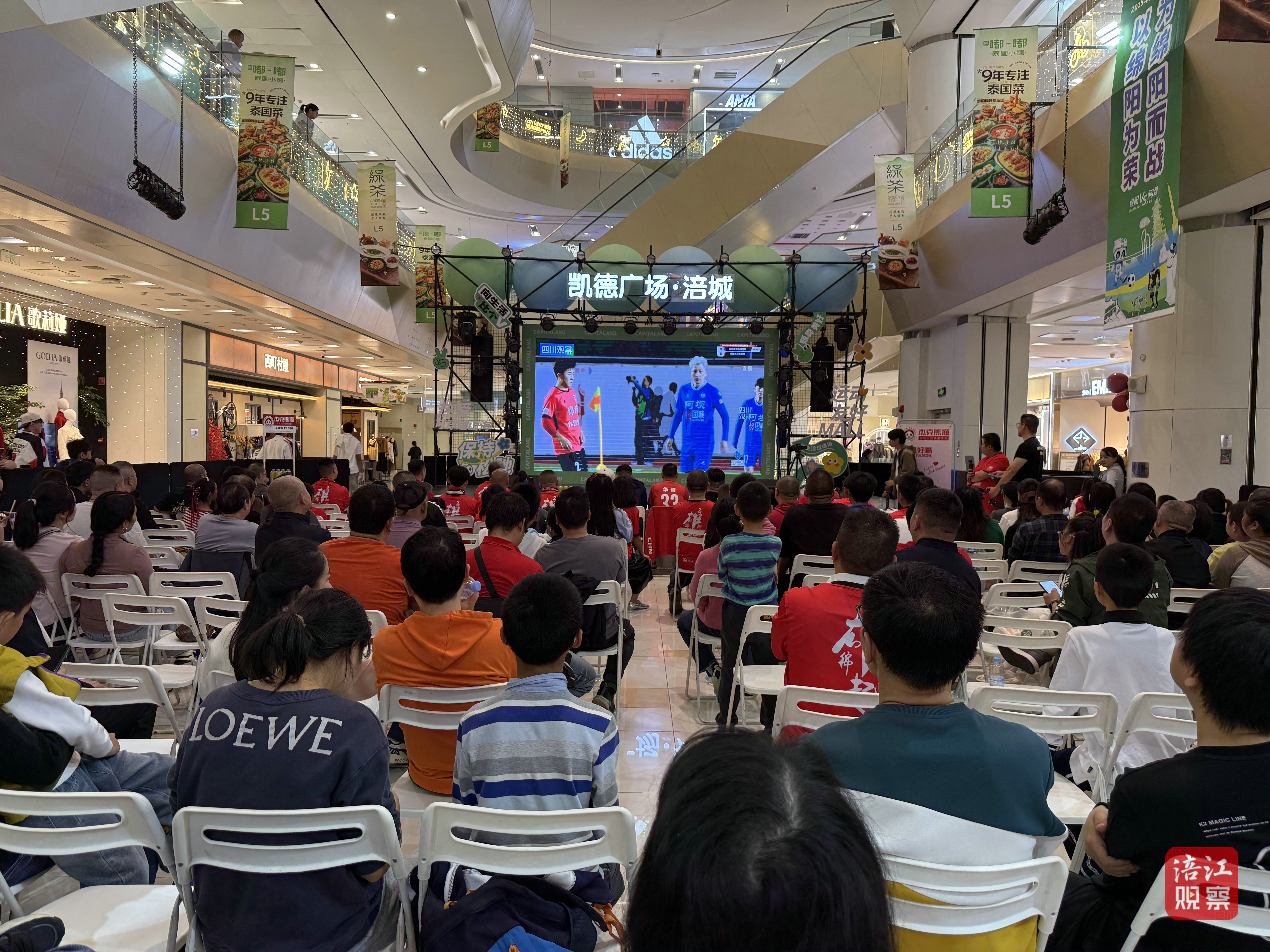 在凱德廣場商場中庭搭建的LED屏幕前 ,不少家長特意帶著孩子前來;年輕球迷則三五成群圍坐在一起。