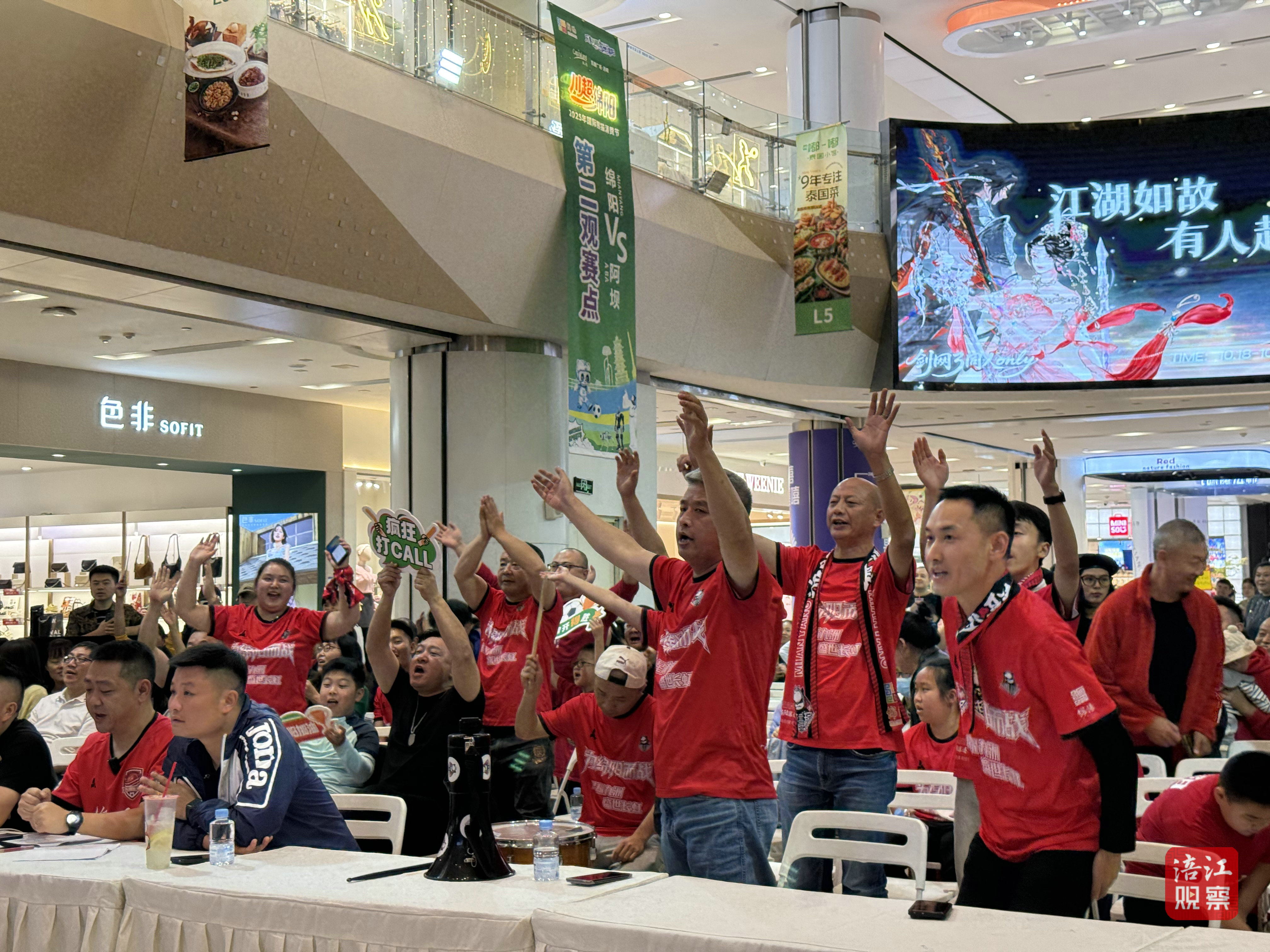 傍晚時(shí)分,球迷早早來到圣名國際購物廣場第二觀賽點(diǎn),手持應(yīng)援牌,通過大屏幕為綿陽隊(duì)加油。