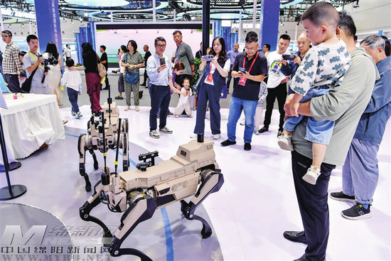 9月27日,在第十三屆中國(guó)(綿陽)科博會(huì)上,兩臺(tái)機(jī)器狗吸引觀眾圍觀。