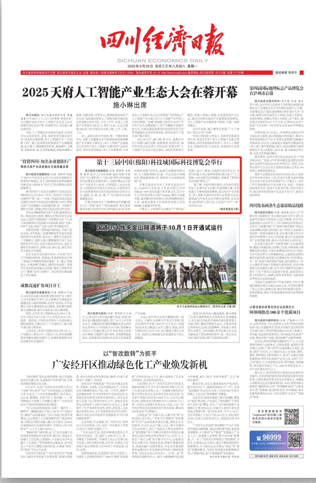 第十三屆中國(guó)(綿陽)科技城國(guó)際科技博覽會(huì)正如火如荼進(jìn)行。9月29日,國(guó)內(nèi)多家媒體紛紛對(duì)科博會(huì)進(jìn)行集中報(bào)道,其中《科技日?qǐng)?bào)》要聞版 、《西安日?qǐng)?bào)》要聞版、《四川經(jīng)濟(jì)日?qǐng)?bào)》頭版共同聚焦這場(chǎng)科技盛宴。